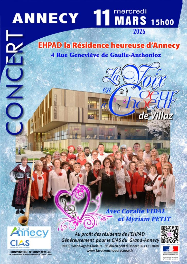 La Voix en Chœur à Cœur de Villaz est ravie de donner une prestation chant et musique tout en partage avec les résidents et le personnel de La Résidence Heureuse du CIAS du Grand-Annecy : mercredi 11 mars 2026 à 15h avec les choristes et leur coach vocale : Coralie VIDAL (pianiste et chanteuse) ainsi que Myriam PETIT (musicienne au Cor des Alpes).